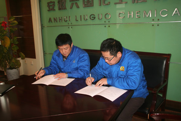 圖為該公司副總經(jīng)理張斌與磷酸車間負(fù)責(zé)人許進(jìn)沖簽訂《安全生產(chǎn)目標(biāo)管理責(zé)任書》。
