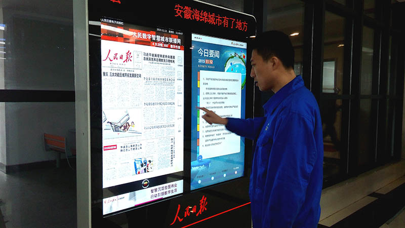 為加強主流輿論陣地建設,銅陵市委宣傳部為我市相關企事業單位贈送、安裝啟用《人民日報》電子閱報欄。該電子閱報欄采用多項專利數字信息技術,集報紙、電視、廣播、網絡等各類信息傳播功能于一體,為該公司員工多渠道、及時了解國內外發生的重大新聞事件及綜合信息提供了便捷。具有占地面積小、外觀靚麗、更新及時傳輸速度快、傳輸容量大、覆蓋面廣、畫面清晰、人屏互動等特點的電子閱報欄,成為了z6mg人生就是博公司又一道靚麗的文化風景線。(張紅麗)
