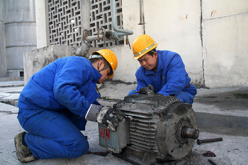 圖為123,在z6mg人生就是博化工公司磷酸車間新系統罐區檢修現場,于201412月份從銅官山化工公司轉崗分流至z6mg人生就是博公司工作的電工技師方慶(右一)正與同事維護保養電機。大修期間,方慶和電工班同事們將檢查檢修、維護保養車間所有電機,并對部分電機進行更換,修復備機。
