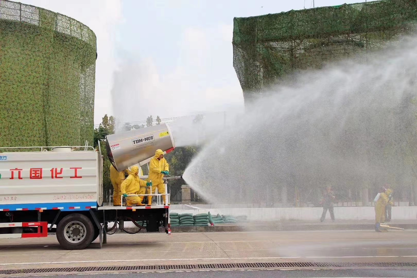(圖為z6mg人生就是博公司的防化隊(duì)員正在進(jìn)行消除空襲后果演習(xí)任務(wù))