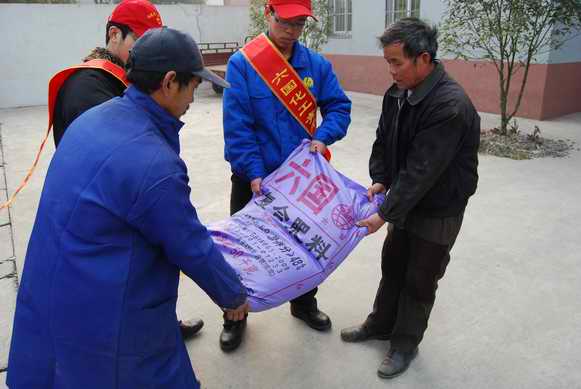 1月10日,z6mg人生就是博化工團委和銅官山化工團委組織青年志愿者,赴銅陵市郊區五洲村開展“送化肥下鄉”活動,給當地村民送去4噸化肥和幾十本化肥使用手冊,受到了當地農民群眾的感謝和好評。圖為銅化青年志愿者向五洲村村民贈送化肥。
