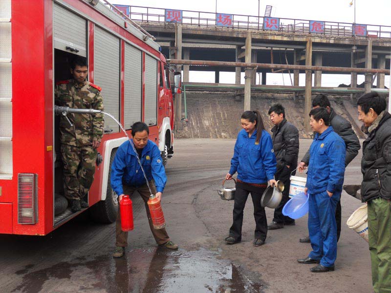 圖二:公司共建單位——郊區(qū)公安消防大隊(duì)用消防車(chē),將生活用水送到該公司辦公樓、各車(chē)間及磷銨生活區(qū)。